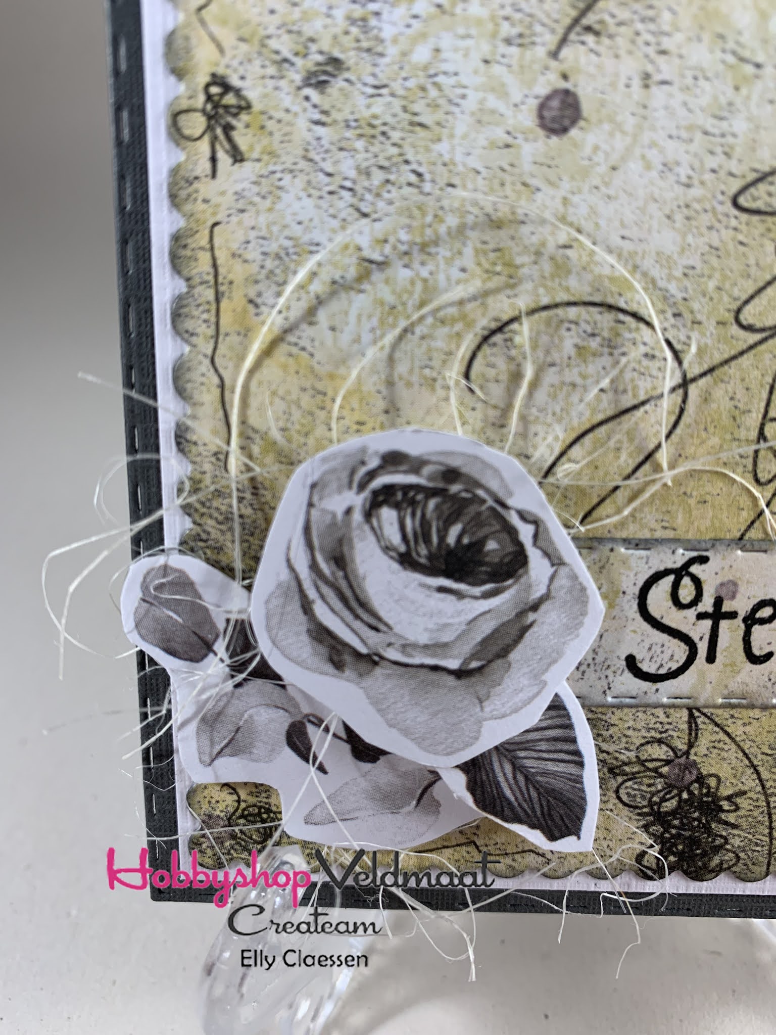 Losse elementen bovenin geplakt, bloemen en blaadjes met daaronder wat sisal.